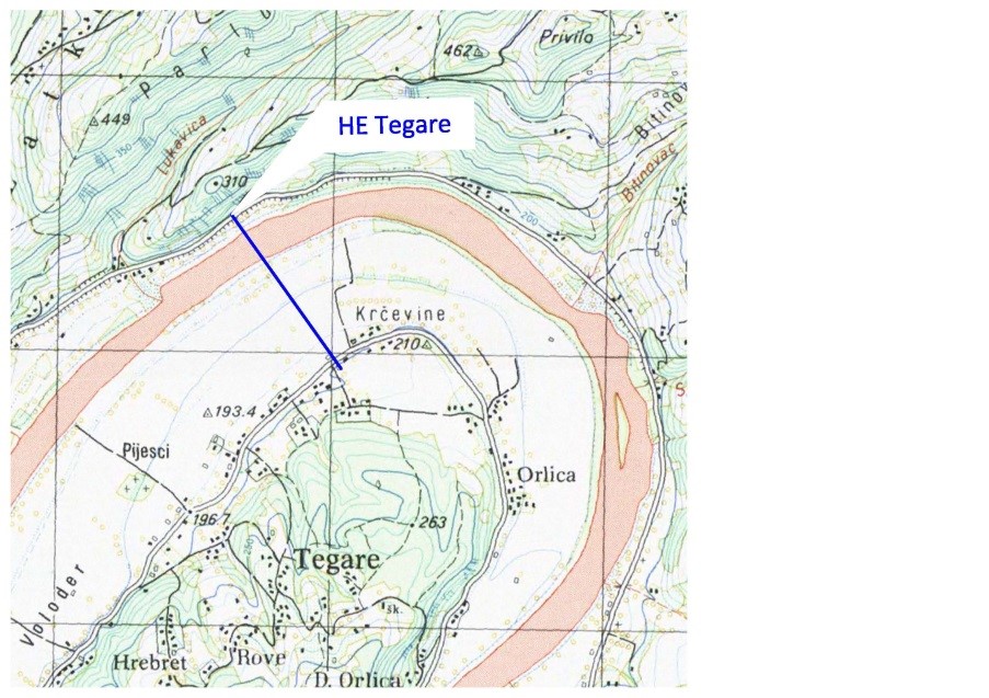 Brana i HE planirane su na srednjem delu toka reke Drine, na stacionaži km 148+750. Lokacija pripada opštini Tegare; najbliži grad je Ljubovija.